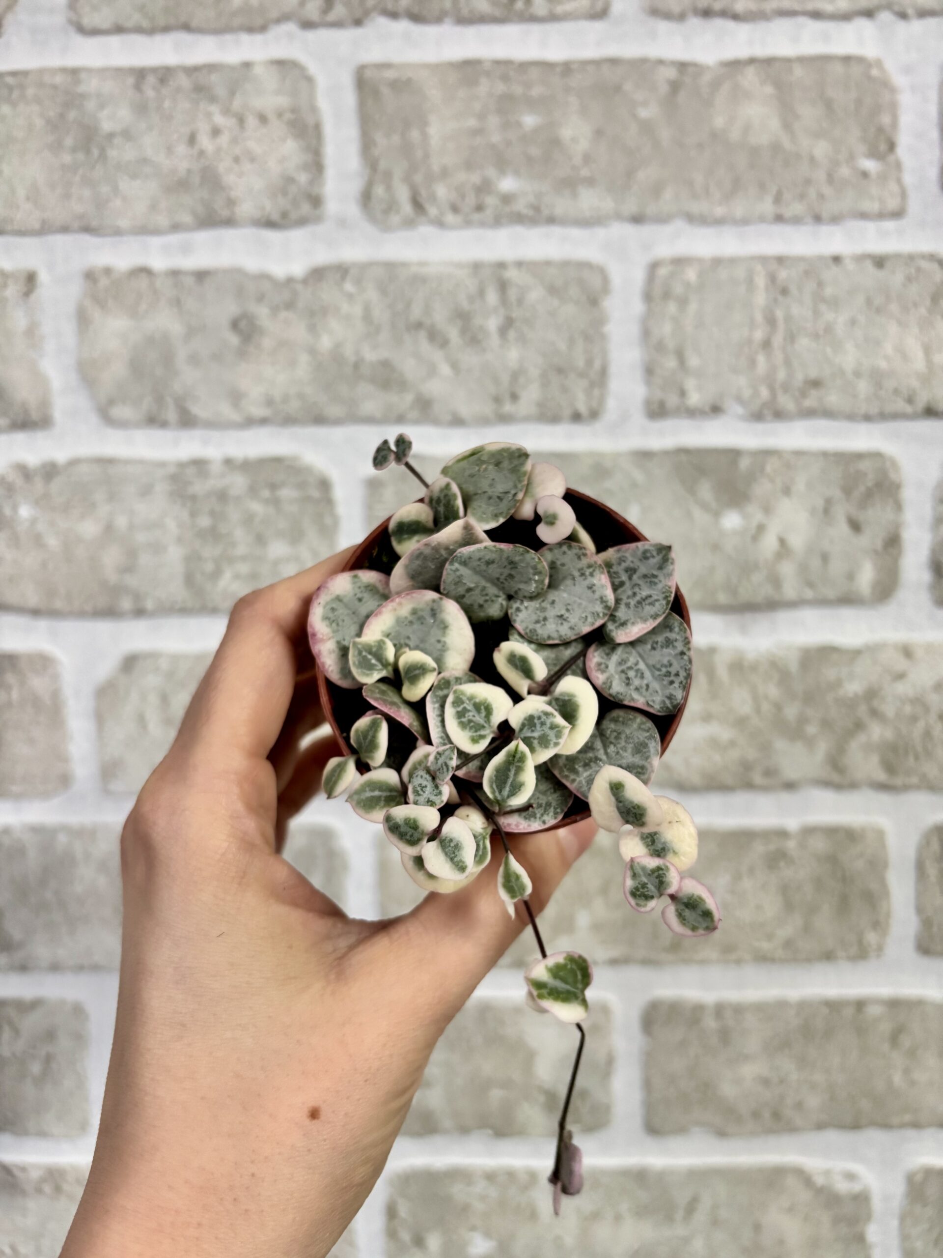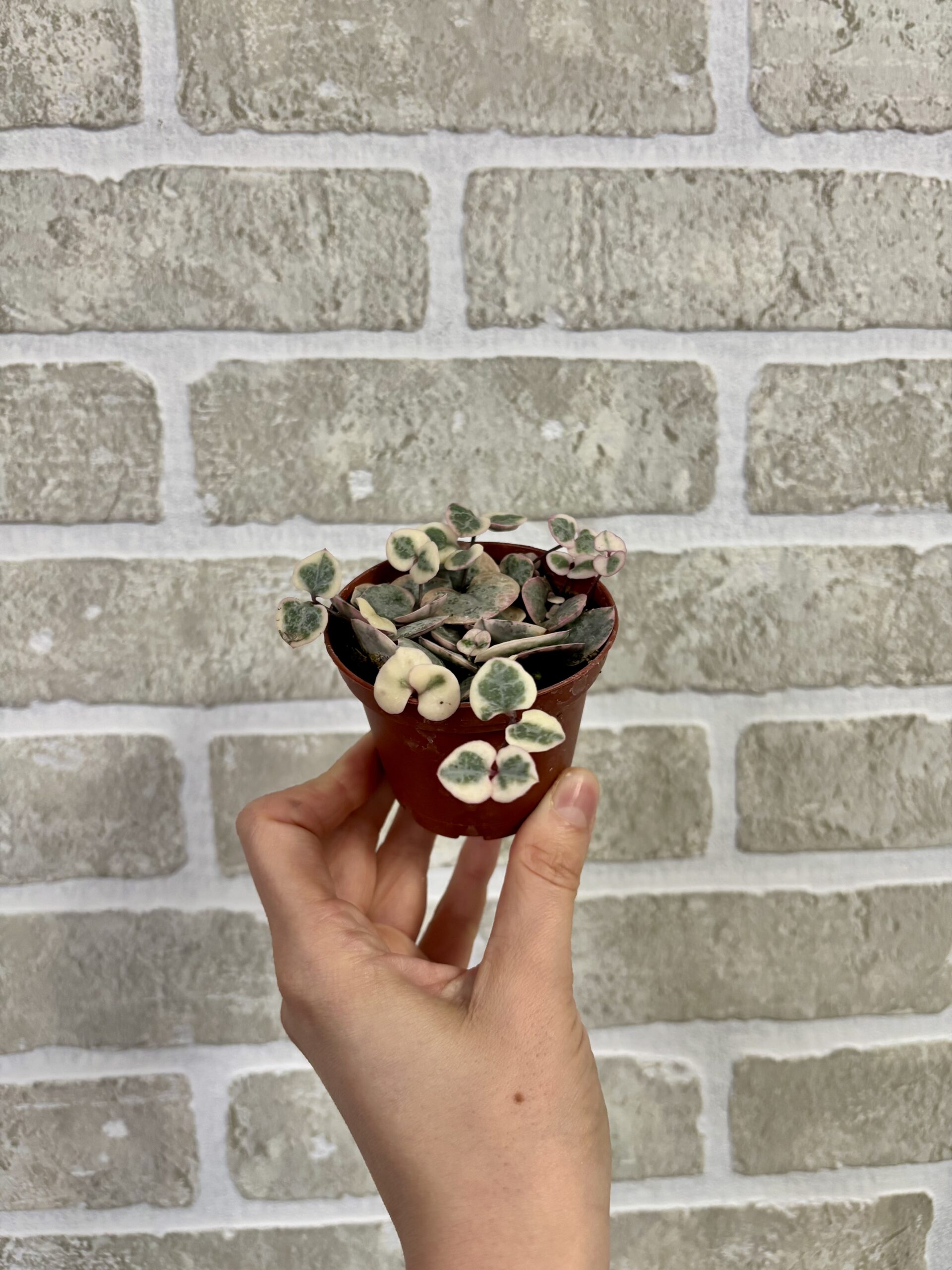 La String of Hearts Variegata séduit par ses petites feuilles en forme de cœur aux teintes rosées, crème et vert, parfaites pour un décor délicat et romantique.